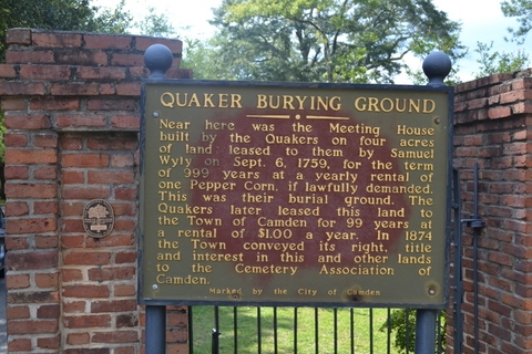 City Directories and History: In circa 1759, Samuel Wyly (Wylie), an early Quaker settler, in the Camden area conveyed four acres of land for a period of 999 years, for the rental of “one Pepper Corn per Year” to the Quakers for their house of worship and a burying ground. A few Quaker family members are buried here but most were long-term residences of Camden who grew to love the beauty of the old cemetery which has now grown to more than fifty acres.