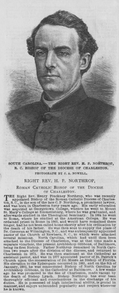 dimensions but entirely different detailing. The intended steeple was never built. The building is constructed of Connecticut brownstone, with star-shaped indentations on the surface. Keely was assisted by a local architect, Decimus C. Barbot. The builder of the cathedral was first Henry L. Cade, who died and was succeeded by Henry Oliver. Keely also designed the altars and episcopal throne in the interior. The stained glass was made by Meyer & Company of Munich. The style of the building has been described as being patterned after German Gothic churches of the 14th century. The gates and fence, which date from the 1850s, are of a simple design.” (Rogers, Charleston in the Age of the Pinckneys, 115; Rhett & Steel, 26-27; O’Connell, Catholicity in the Carolinas, 38-55, 61-65; Whitelaw & Levkoff, 43; Legerton, 66-67; Fraser, Reminiscences, 122; Ravenel, Architects, 254-257; Mazyck & Waddell, 17; Guilday, Life and Times of John England, passim; O’Brien, John England, passim; Stoney, This is Charleston, 16.) – CCPL