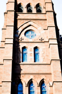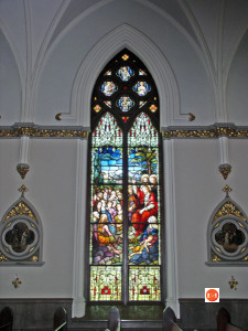 building and is known only as St. John the Baptist; the planned spire for the 100-foot tower has never been built. On the interior, fourteen lancet arched Gothic windows depict the life of Christ, while the great rose window over the altar depicts the Last Supper (taken from Leonardo da Vinci) below the Baptism of Christ by John. The glazing was manufactured by the Franz Mayer Company of Munich and installed in 1907. The windows and interior plasterwork were splendidly restored in 1994-95. The front iron fence to the east, now a part of the cathedral property, is the sole remnant of the 1815 St. Andrew’s Society Hall, burned in 1861.”