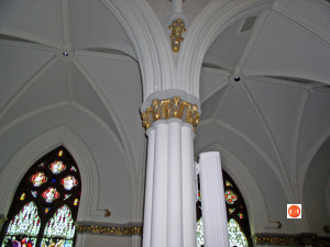arrival and built a small wooden building during the planning of a larger cathedral. England did not live to see the completion by 1854 of the first large Gothic cathedral designed by the Brooklyn architect P. C. Keely, the leading architect of American Catholic churches of the mid-nineteenth century. Tradition holds that Keely studied under the great English Gothic Revivalist A.W. Pugin, architect of the Houses of Parliament. This influence appears in the decorated Gothic cathedral Keely completed in Charleston called St. John the Baptist and St. Finbar. With a nave of 54 feet in height, side aisles of 25 feet, and a tower and spire of 200 feet, this was the largest and most elaborate of Charleston’s antebellum religious buildings.
