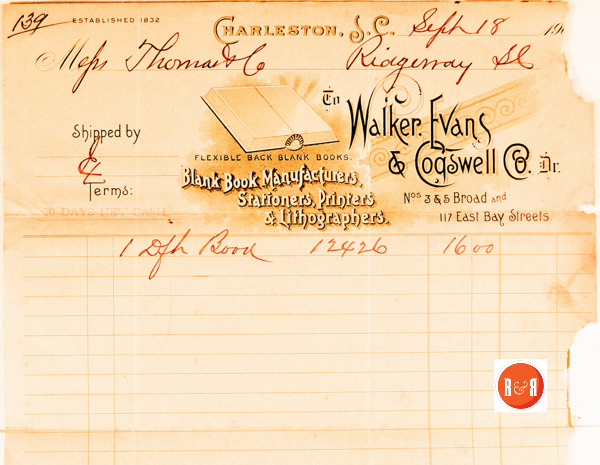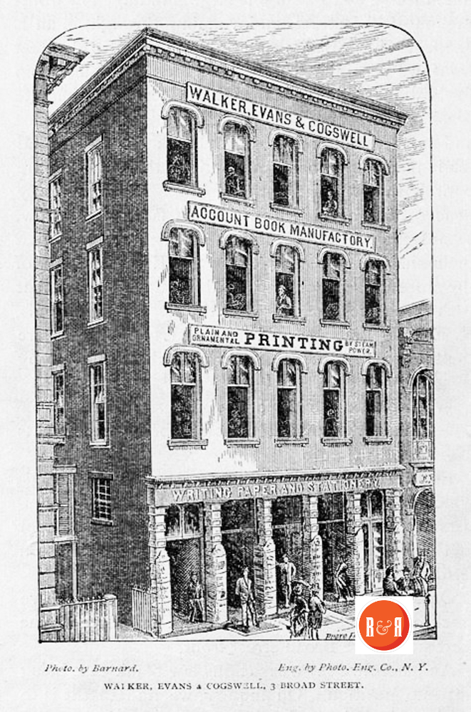 remained in use by the successor company, Walker, Evans & Cogswell, until 1982. The East Bay Street building, formerly of four full stories, boasts a post-earthquake deep pressed metal cornice and mansard roof. The structure at 3 Broad also lost its original brownstone cornice in the earthquake of 1886, after which a pressed tin cornice was added. From 1861 to 1865, the company relocated to Columbia and served as Confederate government printers.”