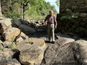 - Mr. Powell points out one of the mill stones remaining on the site.