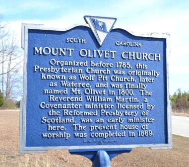 City Directories and History: The Winnsboro area of Fairfield County has been served by a Presbyterian congregation since circa 1773. The Reverend William Martin, a Covenanter minister from Ireland who settled in South Carolina in 1772, preached at the Wolf Pit, a quarter mile from the present Mount Olivet Church, about the time of the American Revolution. In 1785 there was an established church in the vicinity called Wateree Church, after nearby Wateree Creek. The church was subsequently named Mount Olivet Presbyterian Church and a building was constructed near the present site around 1800. The present building, which was completed in 1869, is significant as a basically intact example of a rural church building, illustrating local construction techniques and stylistic characteristics of the period. The church is a one-story, rectangular, front-gabled building. The church is of masonry construction with brick bearing walls which are four bricks thick. The brickwork is covered with stucco, which has been scored to resemble cut stone. The foundation is granite. The large cemetery northwest of the church contains several historically and artistically significant gravestones dating back to 1795 and is enclosed by a cast-iron fence. Listed in the National Register August 13, 1986. [Courtesy of the S.C. Dept. of Archives and History]