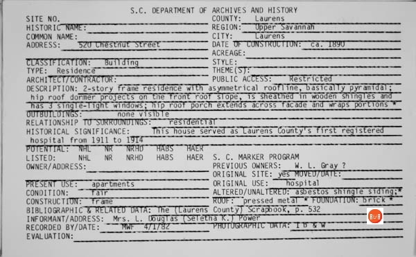 City Directories and History: 1917 – J.H. Sullivan, 1948 – John F. Arrington, Margaret S. Arrington, Arthur L. Backsman (Vet), William D. Brooks, Andrew H. Hall, 1975 – Opal Dotson, Jean Parris, Pamela Sue Parris