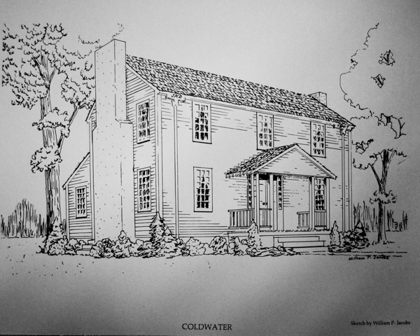 Until recent years the gutter boxes of Coldwater had inscribed on them J.H.D. 1847 and a sun-moon-star inscription. Since such things were made by special process, it is thought that they might not have been put up when the house was built. Relatives have removed the inscriptions for safekeeping.