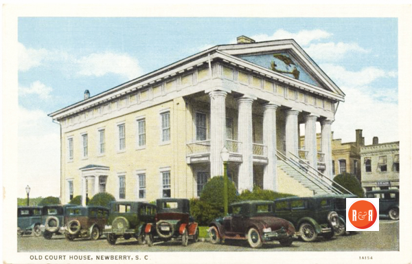 proportions attest to the affluence of pre-Civil War Newberry County. During Reconstruction, Osborne Wells was assigned the task of remodeling the courthouse. Wells’ additions included two-column porticos at side entrances and a bas-relief mounted on the frontal pediment. This bas-relief depicts the spirit of the prostrate state: a U.S. eagle holds an uprooted palmetto tree in its talons; perched upon the tree roots is a gamecock crowing defiantly; at the top of the tree a dove bears an olive branch. This building, the fourth in a series of five County Courthouses, was used for court sessions between 1852 and 1906. Listed in the National Register August 19, 1971. [Courtesy of the S.C. Dept. of Archives and History]