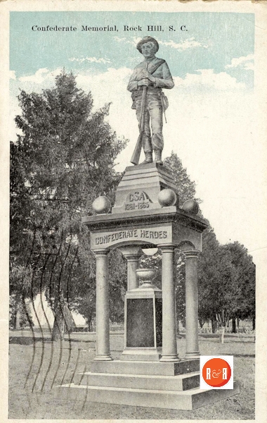 The Confederate Monument – The monument occupies the highest point in the cemetery. Rock Hill’s first Confederate monument was erected in Confederate Park in 1922 by the Ann White Chapter of the United Daughters of the Confederacy (UDC). This statue was designed and carved by Rock Hill artisan John G. Sassi, an Italian immigrant who lived and operated a monument works just down the hill on the corner of West White Street and Laurel Street. Unfortunately, the monument in the park was subjected to vandalism. In 1936, the base of the monument was moved to this site, and a new soldier statue was ordered from Italy.