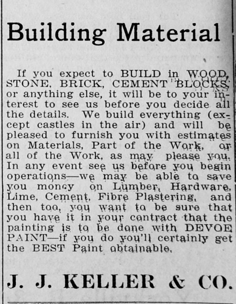 The RH Record reported on Aug 26, 1907 – Contained an ad from J.J. Keller Contractors – which stated, “Do you contemplate building? If so, we have in our employee an experienced architect who can draw any plan or do any design you may wish.”