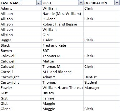 Thomas Cartwright, William H. Fowler, Teresa Fowler, Daisey Gist, Fannie Gist, Maggie Gist, Maggie Glenn, G. Foster Grant & wife Lula E. Grant (1908 – lumberman w J.J. Keller Co.), Earle Grist, Eunice Grist, Maggie Grist, George Grist, Mamie L. Grist, Sam M. Grist, (1908 – agent for Globe & Rutgers Fire Insurance Co., and General Insurance) also, North British & Mercantile Co agent, Sallie Grist (1908 – wife of Sam Grist),