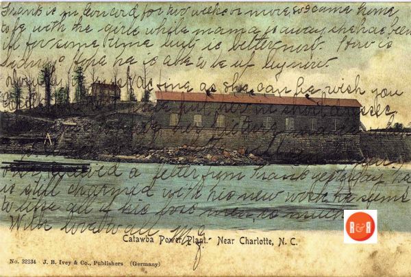 The Rock Hill Record reported on Feb. 5, 1904 – “That Dr. Gill Wylie was here to inspect the dam of the power company. One of the large generators is in operation. The Rock Hill Water and Power Company has purchased a transformer in order to use the power. Several textile mills have contracted for power and several others are under consideration. The Victoria, Arcade and Manchester mills will be able to use power in two – three months when they have completed installing transformers. Dr. Wylie says the water has been backed up behind the dam to the expected level based on survey lines. Bids are to be taken by the Catawba Power Company to provide Charlotte lighting for street lamps.”